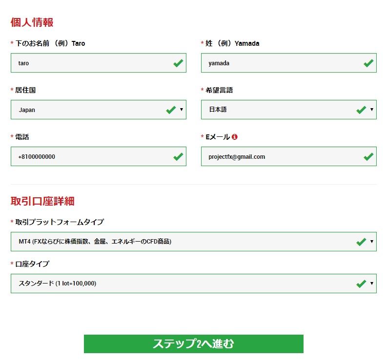 氏名は、居住国、言語、電話番号、メールアドレスを記入します。