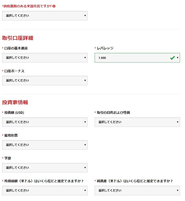 基本通過は日本円(JPY)、レバレッジはたくさんの中から選べますが、最大限資金を活用するには1:888を選択するとよいと思います。